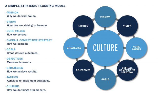 How can family firm leaders incorporate deep strategic thinking into a strategic plan that provides clear direction for an entire organization? A simple but effective method is depicted in Figure 2. The process starts with defining a clear mission and then proceeds clockwise around the model, with one step leading to the next until very specific tactics designed to implement operating strategies and the overall competitive strategy are identified. Culture is depicted in the center of the model since it is central to an organization’s ability to execute on its strategy. Overall competitive strategy and culture are highlighted in red text because they are reflections of deep strategic thinking and are often missing elements of strategic plans.
